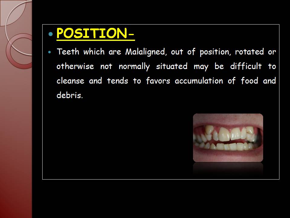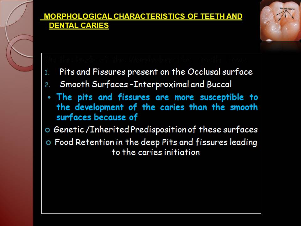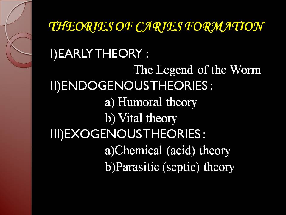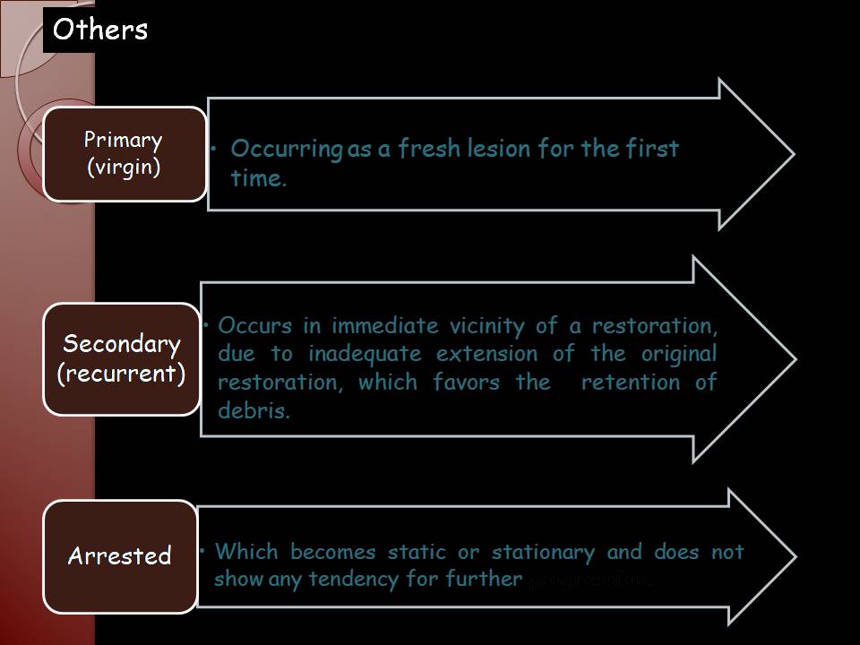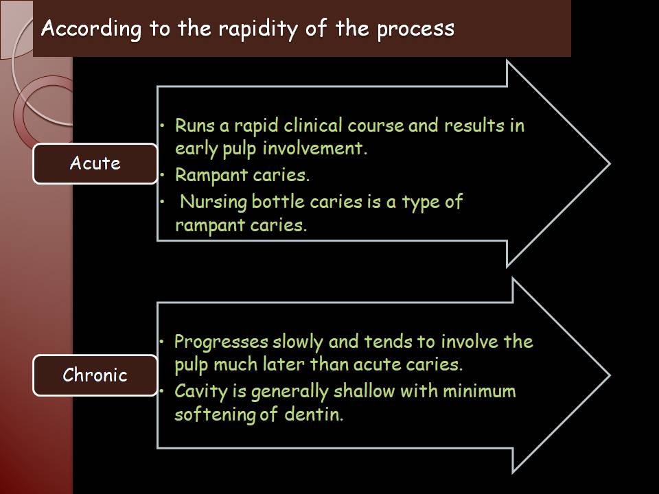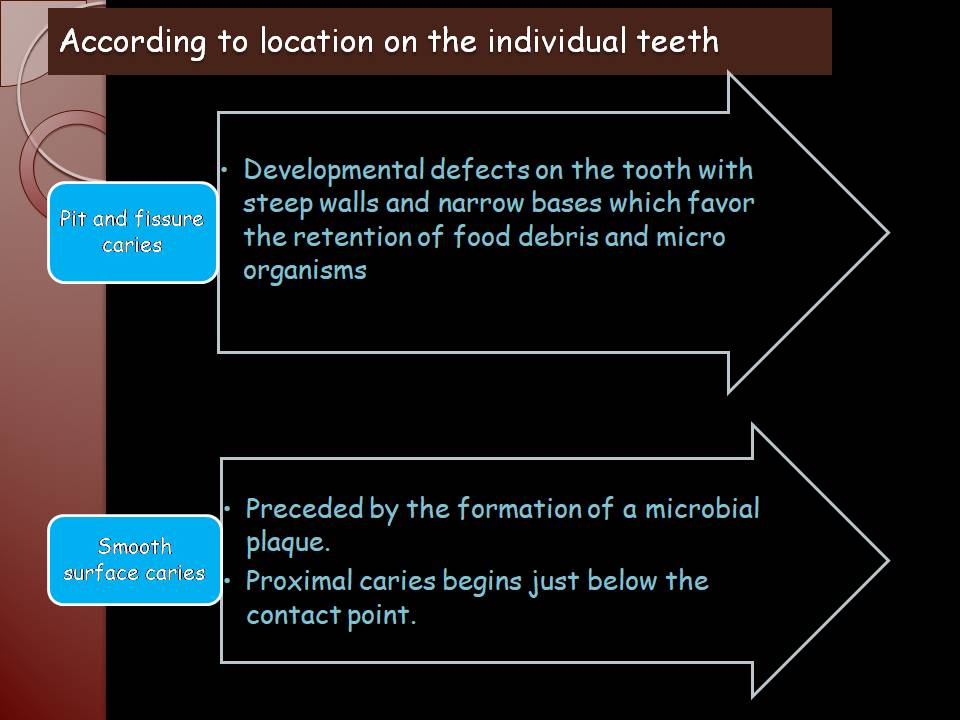 or occlusal cusp heights of posterior teeth. According to location on the individual teeth According to the rapidity of the process Others THEORIES OF CARIES FORMATION