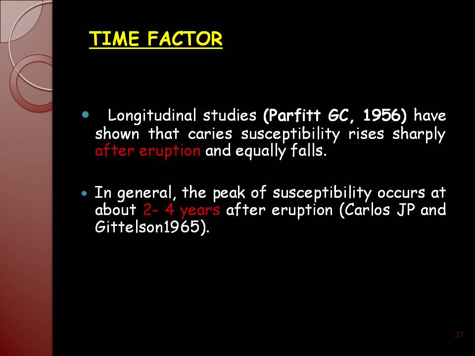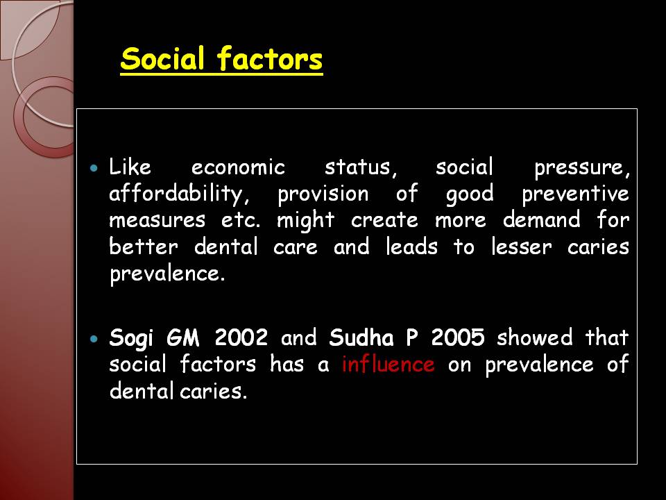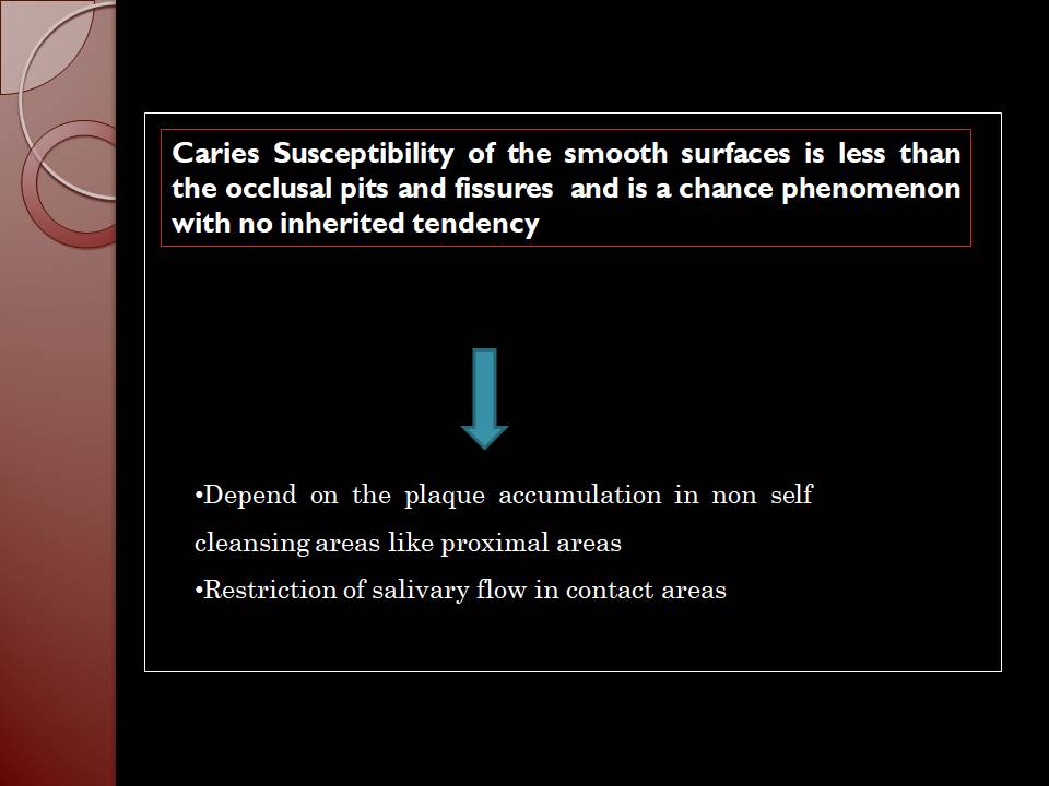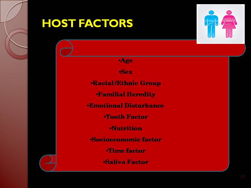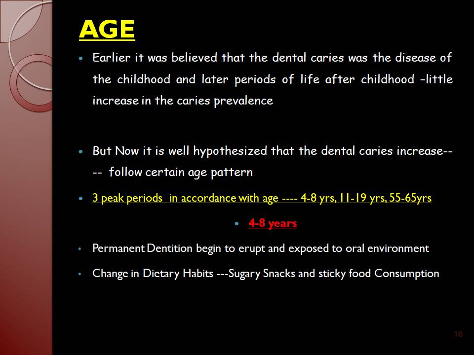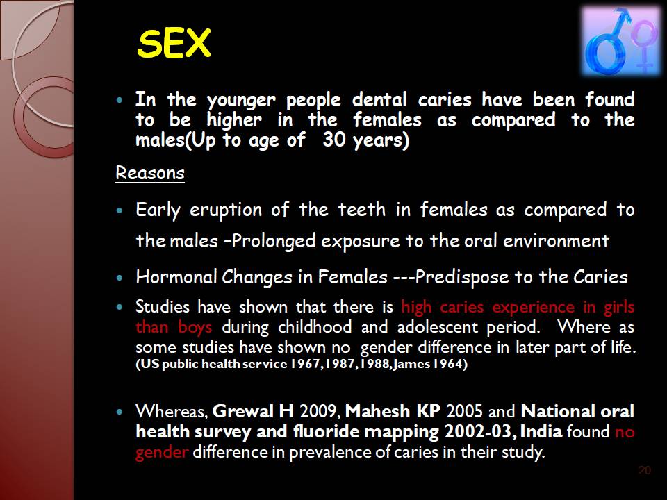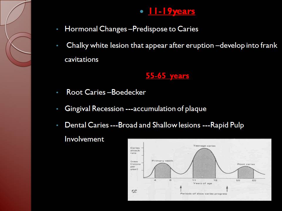 55-65 years • Root Caries –Boedecker •Gingival Recession —accumulation of plaque •Dental Caries —Broad and Shallow lesions —Rapid Pulp Involvement • SEX In the younger people dental caries have been found to be higher in the females as compared to the males(Up to age of 30 years)