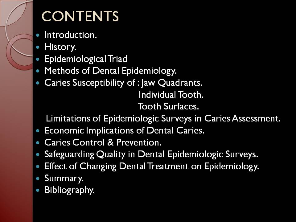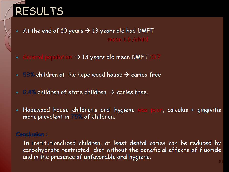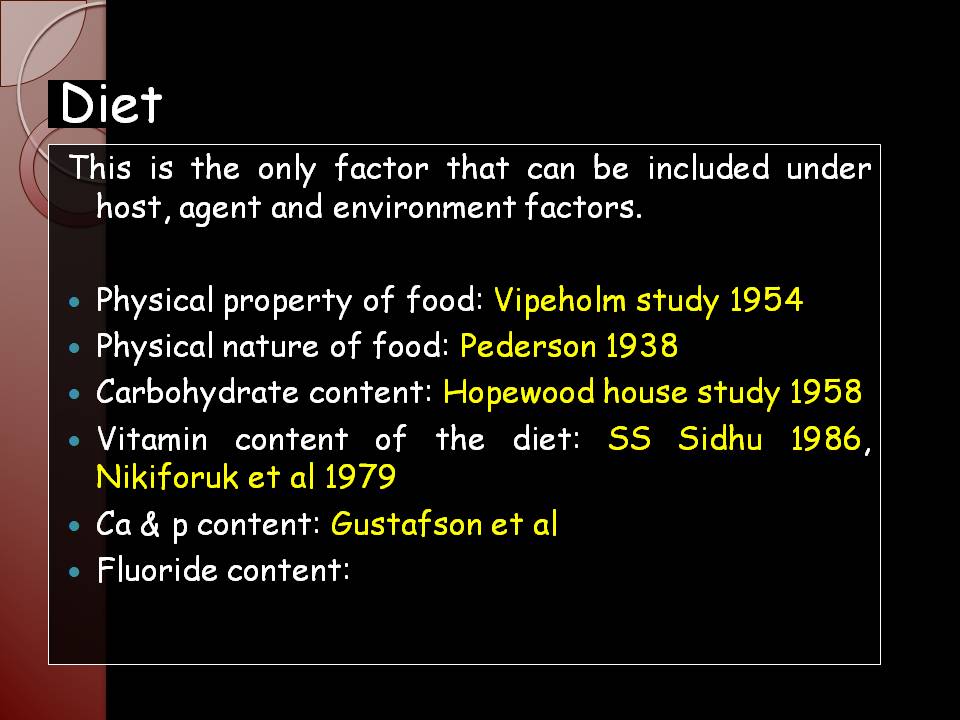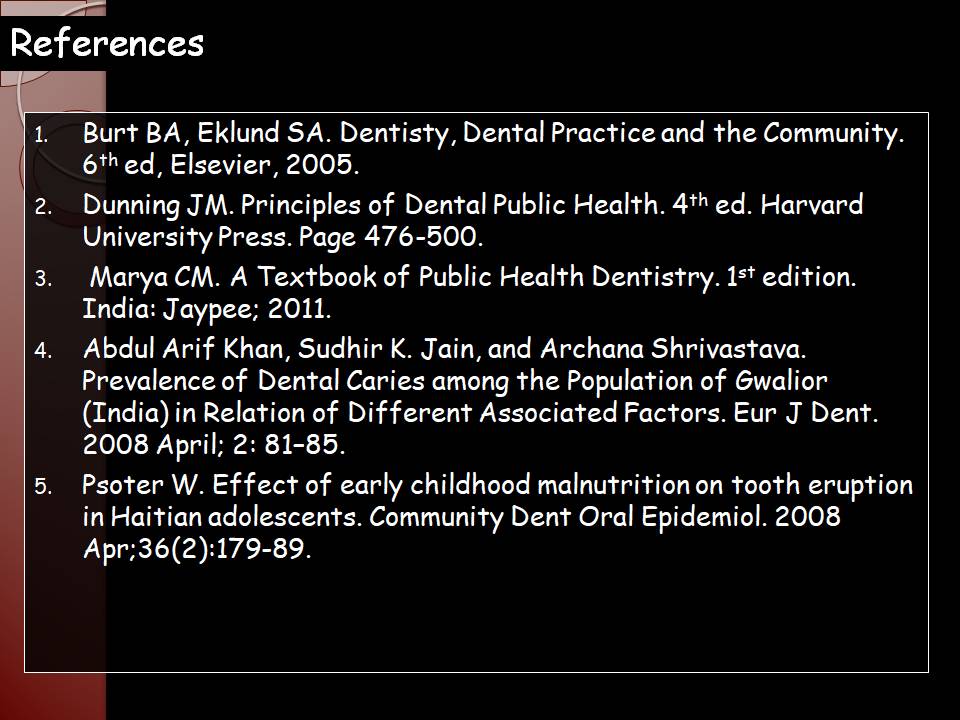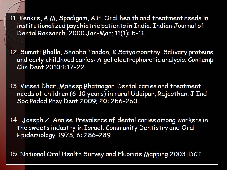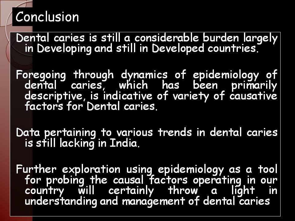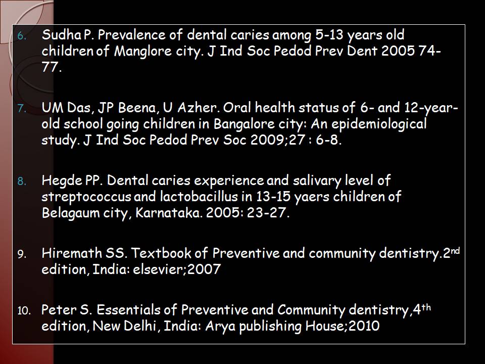 Further exploration using epidemiology as a tool for probing the causal factors operating in our country will certainly throw a light in understanding and management of dental caries 1.Burt BA, Eklund SA. Dentisty, Dental Practice and the Community. 6th ed, Elsevier, 2005. 2.Dunning JM. Principles of Dental Public Health. 4th ed. Harvard University Press. Page 476-500. 3. Marya CM. A Textbook of Public Health Dentistry. 1st edition. India: Jaypee; 2011. 4.Abdul Arif Khan, Sudhir K. Jain, and Archana Shrivastava. Prevalence of Dental Caries among the Population of Gwalior (India) in Relation of Different Associated Factors. Eur J Dent. 2008 April; 2: 81–85. 5.Psoter W. Effect of early childhood malnutrition on tooth eruption in Haitian adolescents. Community Dent Oral Epidemiol. 2008 Apr;36(2):179-89. ● ● ● 6.Sudha P. Prevalence of dental caries among 5-13 years old children of Manglore city. J Ind Soc Pedod Prev Dent 2005 74-77. ● 7.UM Das, JP Beena, U Azher. Oral health status of 6- and 12-year-old school going children in Bangalore city: An epidemiological study. J Ind Soc Pedod Prev Soc 2009;27 : 6-8. ● 8.Hegde PP. Dental caries experience and salivary level of streptococcus and lactobacillus in 13-15 yaers children of Belagaum city, Karnataka. 2005: 23-27. ● 9.Hiremath SS. Textbook of Preventive and community dentistry.2nd edition, India: elsevier;2007 ● 10.Peter S. Essentials of Preventive and Community dentistry,4th edition, New Delhi, India: Arya publishing House;2010