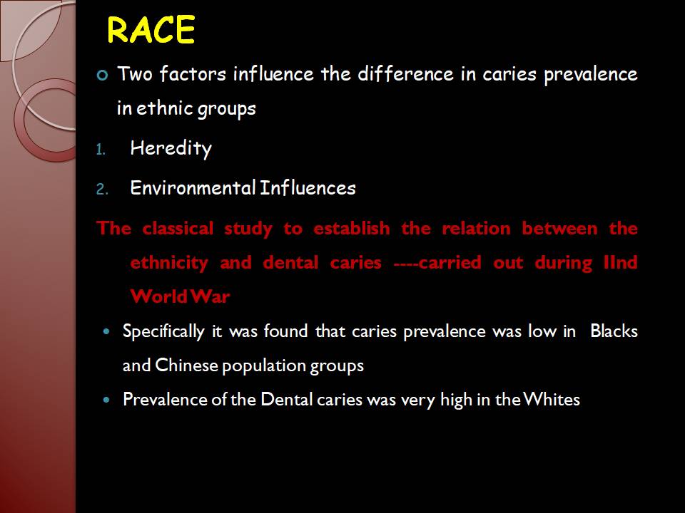Reasons Early eruption of the teeth in females as compared to the males –Prolonged exposure to the oral environment Hormonal Changes in Females —Predispose to the Caries Studies have shown that there is high caries experience in girls than boys during childhood and adolescent period. Where as some studies have shown no gender difference in later part of life. (US public health service 1967, 1987, 1988, James 1964) Whereas, Grewal H 2009, Mahesh KP 2005 and National oral health survey and fluoride mapping 2002-03, India found no gender difference in prevalence of caries in their study. RACE ¢Two factors influence the difference in caries prevalence in ethnic groups 1.Heredity 2.Environmental Influences