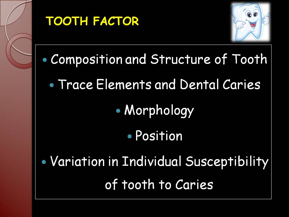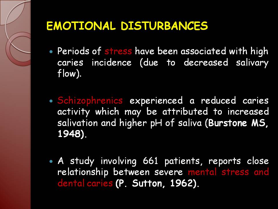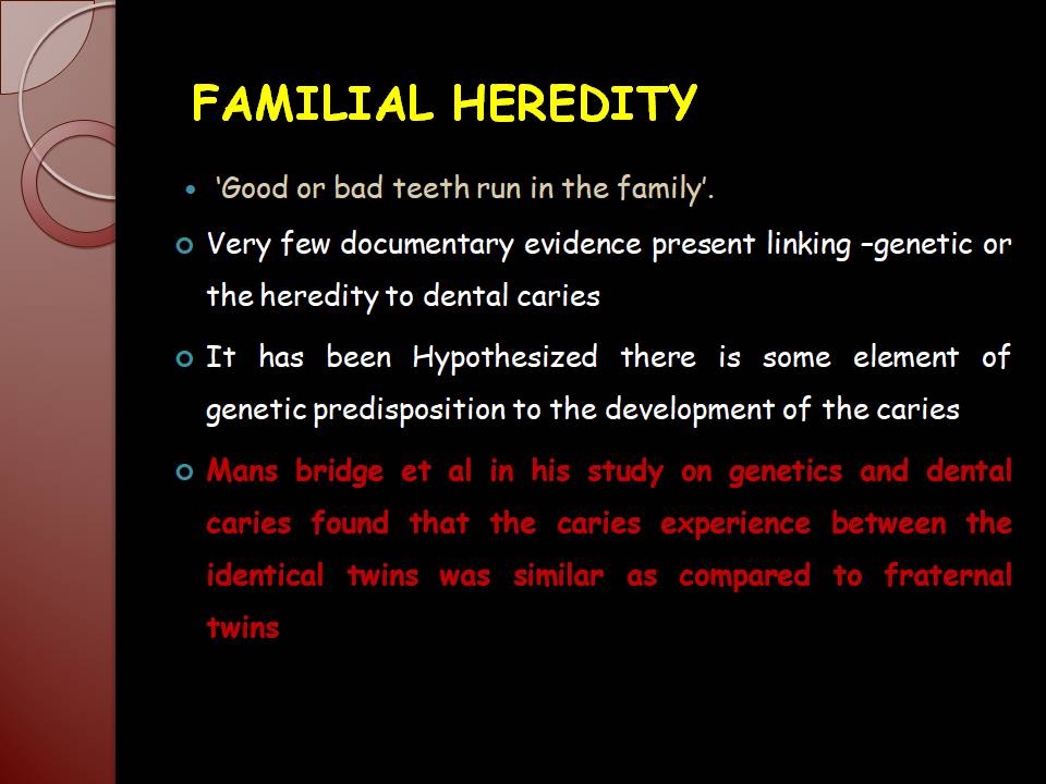 The classical study to establish the relation between the ethnicity and dental caries —-carried out during IInd World War Specifically it was found that caries prevalence was low in Blacks and Chinese population groups Prevalence of the Dental caries was very high in the Whites FAMILIAL HEREDITY ‘Good or bad teeth run in the family’. ¢Very few documentary evidence present linking –genetic or the heredity to dental caries ¢It has been Hypothesized there is some element of genetic predisposition to the development of the caries ¢Mans bridge et al in his study on genetics and dental caries found that the caries experience between the identical twins was similar as compared to fraternal twins EMOTIONAL DISTURBANCES Periods of stress have been associated with high caries incidence (due to decreased salivary flow). Schizophrenics experienced a reduced caries activity which may be attributed to increased salivation and higher pH of saliva (Burstone MS, 1948). A study involving 661 patients, reports close relationship between severe mental stress and dental caries (P. Sutton, 1962). Composition and Structure of Tooth Trace Elements and Dental Caries Morphology Position Variation in Individual Susceptibility of tooth to Caries