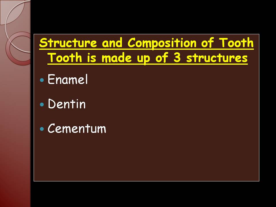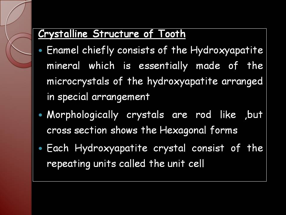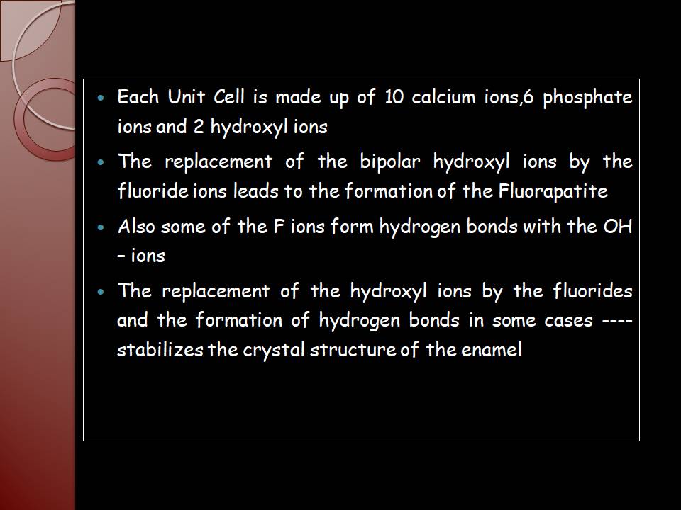 Crystalline Structure of Tooth Enamel chiefly consists of the Hydroxyapatite mineral which is essentially made of the microcrystals of the hydroxyapatite arranged in special arrangement Morphologically crystals are rod like ,but cross section shows the Hexagonal forms Each Hydroxyapatite crystal consist of the repeating units called the unit cell Each Unit Cell is made up of 10 calcium ions,6 phosphate ions and 2 hydroxyl ions The replacement of the bipolar hydroxyl ions by the fluoride ions leads to the formation of the Fluorapatite Also some of the F ions form hydrogen bonds with the OH – ions The replacement of the hydroxyl ions by the fluorides and the formation of hydrogen bonds in some cases —-stabilizes the crystal structure of the enamel