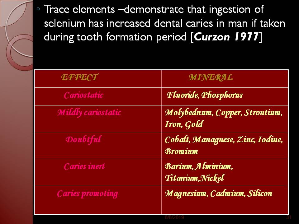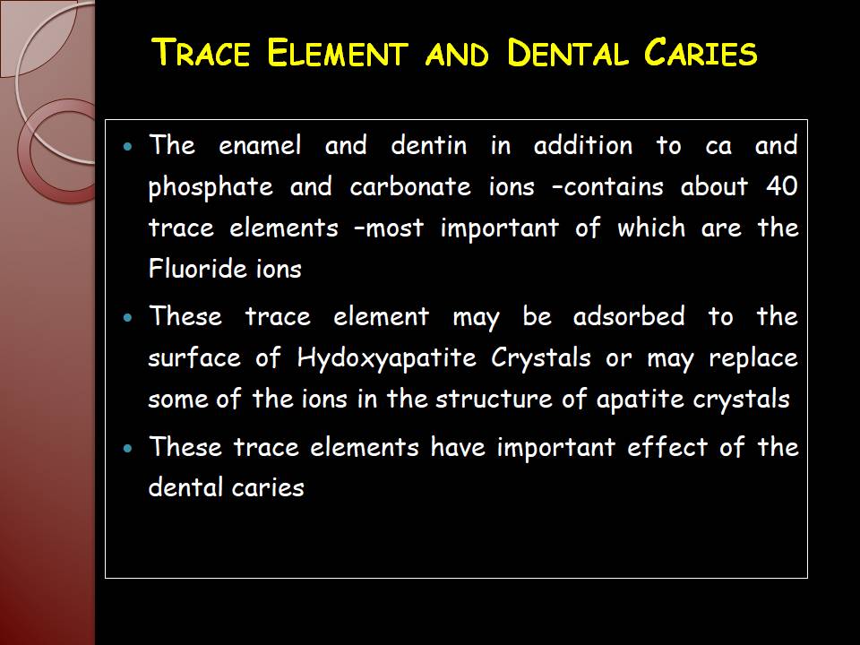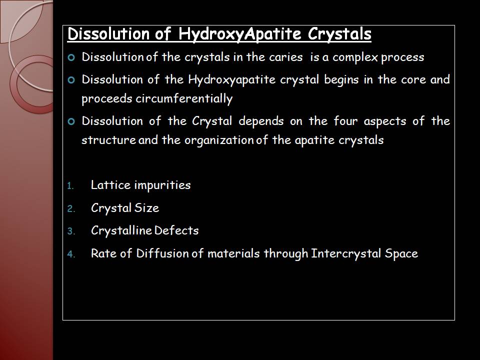 Dissolution of HydroxyApatite Crystals ¢Dissolution of the crystals in the caries is a complex process ¢Dissolution of the Hydroxyapatite crystal begins in the core and proceeds circumferentially ¢Dissolution of the Crystal depends on the four aspects of the structure and the organization of the apatite crystals 1.Lattice impurities 2.Crystal Size 3.Crystalline Defects 4.Rate of Diffusion of materials through Intercrystal Space The enamel and dentin in addition to ca and phosphate and carbonate ions –contains about 40 trace elements –most important of which are the Fluoride ions These trace element may be adsorbed to the surface of Hydoxyapatite Crystals or may replace some of the ions in the structure of apatite crystals These trace elements have important effect of the dental caries ◦Trace elements –demonstrate that ingestion of selenium has increased dental caries in man if taken during tooth formation period [Curzon 1977]