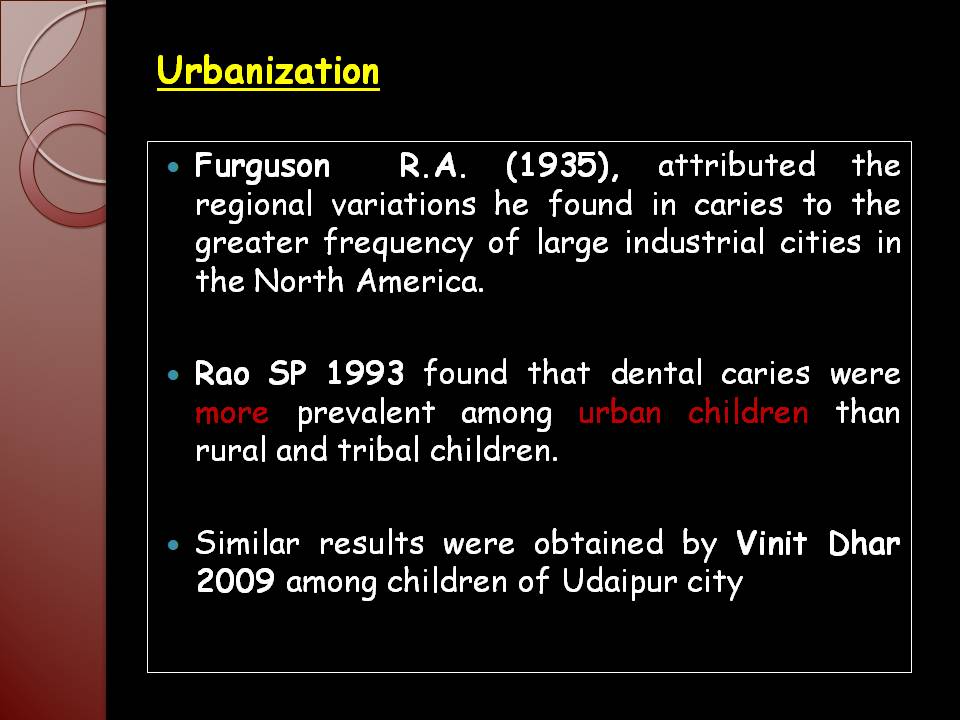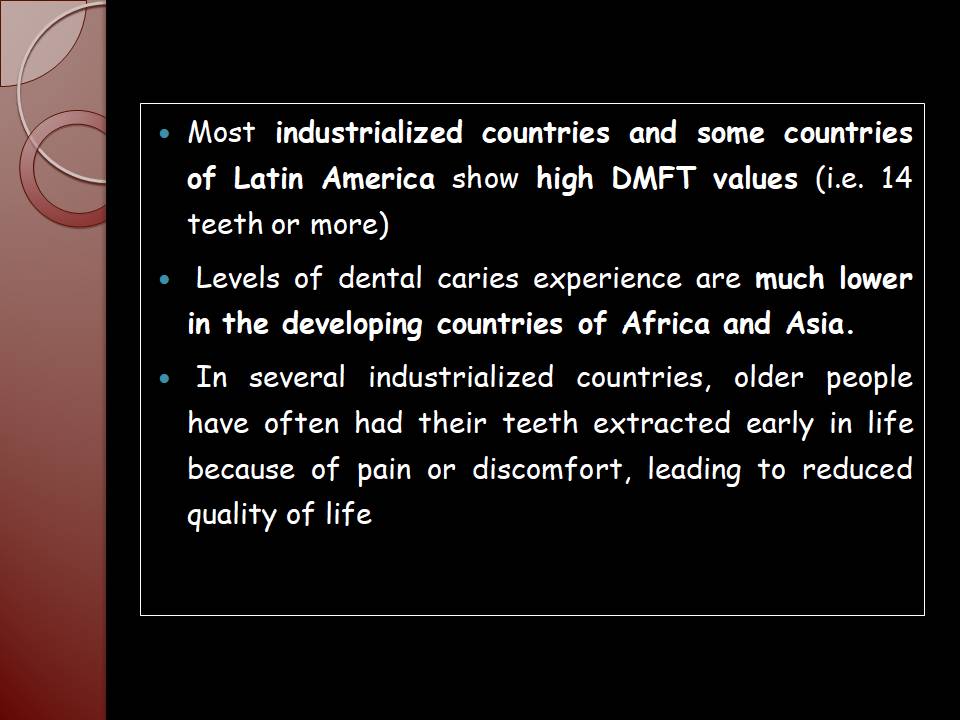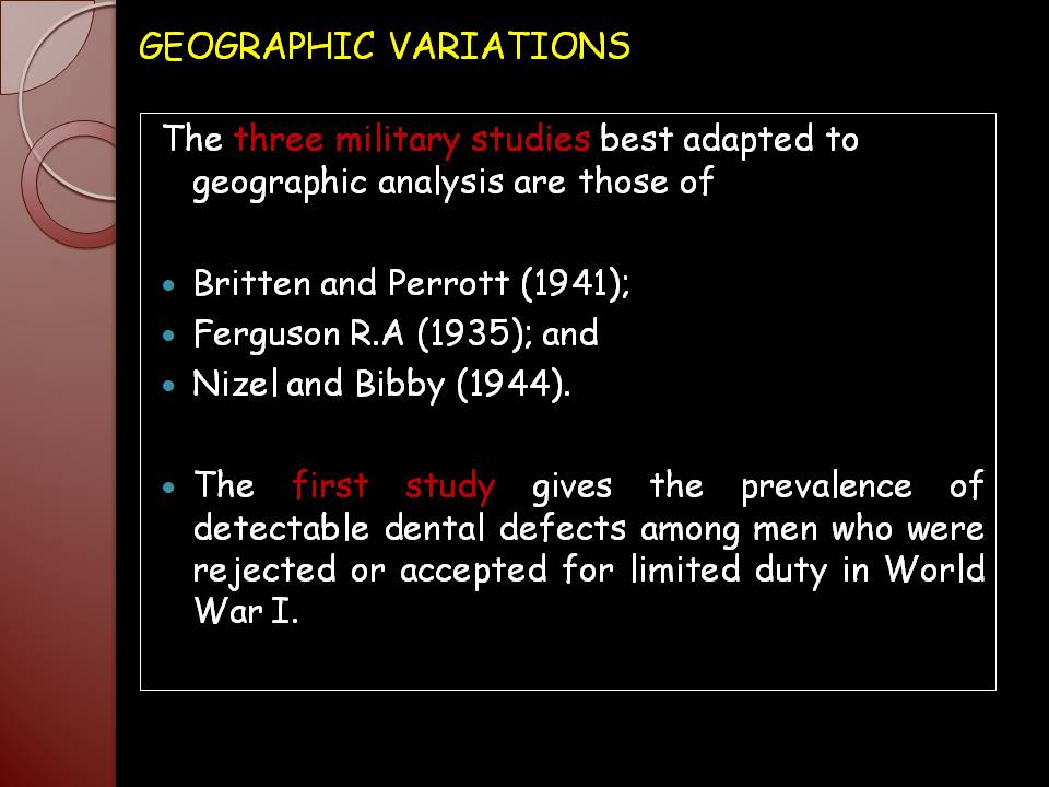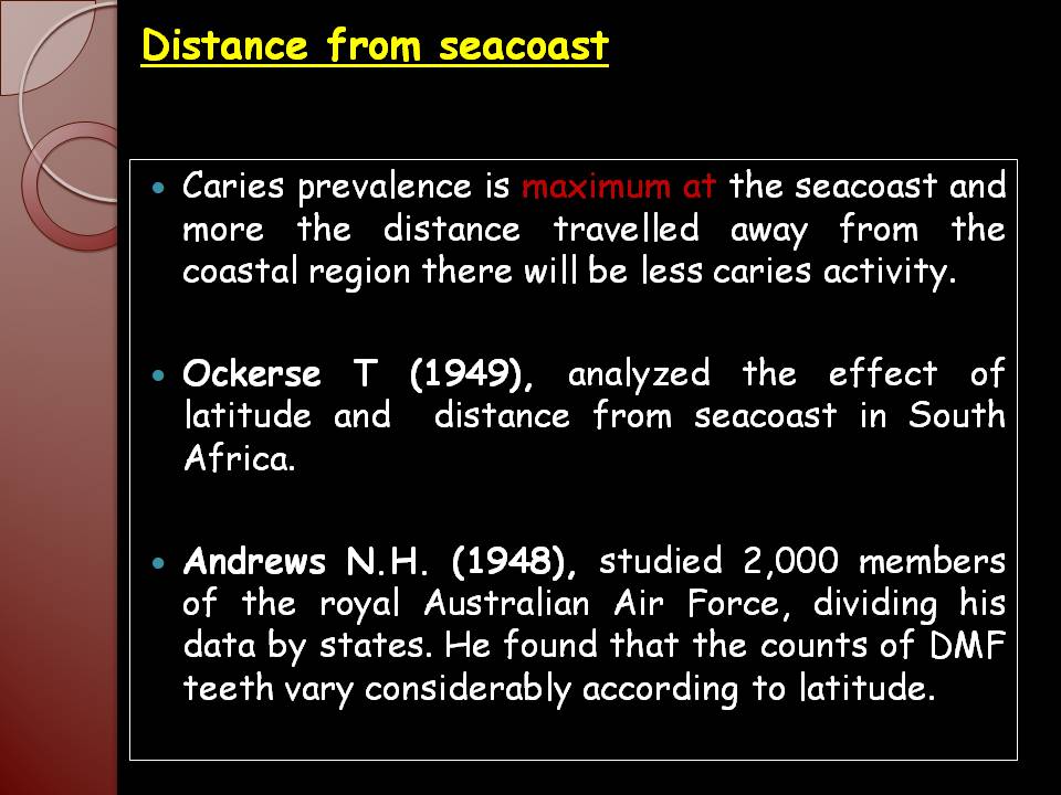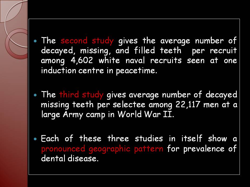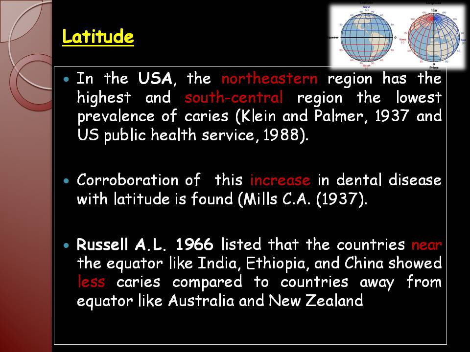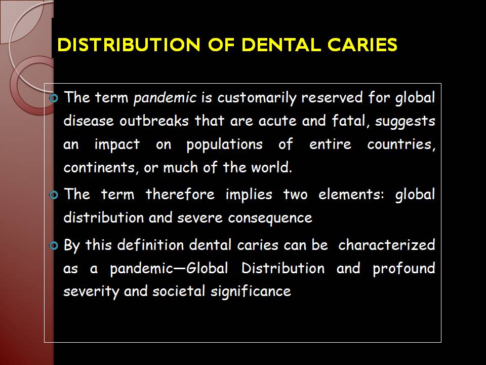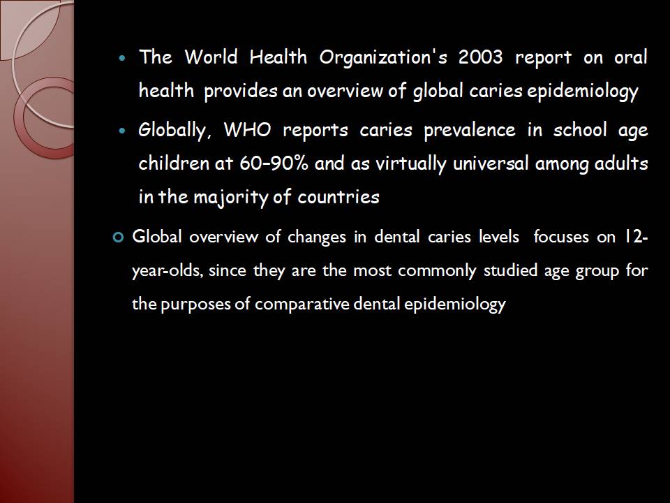 The three military studies best adapted to geographic analysis are those of Britten and Perrott (1941); Ferguson R.A (1935); and Nizel and Bibby (1944). The first study gives the prevalence of detectable dental defects among men who were rejected or accepted for limited duty in World War I. The second study gives the average number of decayed, missing, and filled teeth per recruit among 4,602 white naval recruits seen at one induction centre in peacetime. The third study gives average number of decayed missing teeth per selectee among 22,117 men at a large Army camp in World War II. Each of these three studies in itself show a pronounced geographic pattern for prevalence of dental disease. Latitude In the USA, the northeastern region has the highest and south-central region the lowest prevalence of caries (Klein and Palmer, 1937 and US public health service, 1988). Corroboration of this increase in dental disease with latitude is found (Mills C.A. (1937). Russell A.L. 1966 listed that the countries near the equator like India, Ethiopia, and China showed less caries compared to countries away from equator like Australia and New Zealand Distance from seacoast Caries prevalence is maximum at the seacoast and more the distance travelled away from the coastal region there will be less caries activity. Ockerse T (1949), analyzed the effect of latitude and distance from seacoast in South Africa. Andrews N.H. (1948), studied 2,000 members of the royal Australian Air Force, dividing his data by states. He found that the counts of DMF teeth vary considerably according to latitude. Sunshine Total possible hours of sunshine per year actually increase a little as near to equator (US dept. of Commerce, Weather Bureau publication no. 805, reprinted 1944), since long days in summer compensates for long nights in winter. Ultraviolet (UV) light from the sun promotes synthesis of vitamin D and along with the other factors it might account for the lower caries experience. The less the mean annual hours of sunshine high is the caries prevalence and vice a versa as shown in the studies in US and the US weather bureau map no. 13. Temperature Temperature varies with latitude and altitude. It acts to vary the caloric requirements and water intake of humans. Hence lower the temperature, higher the caries prevalence. Relative humidity Humidity shows a higher correlation with caries prevalence. Higher the humidity, more moisture in the atmosphere which block the UV rays and sunlight. Hence increased caries activity. Data from Australian states shows a higher correlation between caries and relative humidity than between caries and any other climatic factor. Bhat M 2007 found higher caries in children from fisher folk community. Rainfall Rainfall acts by leaching off minerals including fluoride from the soil and also by blocking sunlight. Rainfall and humidity are linked to dental caries prevalence, either separately or together. Fluoride Higher the fluoride content in the soil and ground water, lesser the caries. The maximum caries reduction is noticed at the level of 1 ppm of fluoride from all sources- from water, soil, atmosphere, food etc. Van Burkalow’s mapping (1946), of maximum fluoride concentration in communal and non communal water supplies on a country basis gives the most comprehensive material available for united states. Total water hardness Water hardness is measured by the concentration of calcium carbonate. An inverse relation is seen between caries and water hardness. Rose C; 1909; Mills C.A. 1937 and Ockerse T. 1949, are among the authors who have reported an inverse relationship. Soils Soil composition bears an influence on caries, where populations consume largely locally grown foodstuffs. Children in Napier, who consumed locally grown food containing a higher molybdenum and also higher pH, resulting in low caries prevalence. Ludwig, Healy, and Malthus (1962- Newzealand), noted marked difference in caries between the towns of Napier and Hastings, without any environmental factor other than soil to account for it. Urbanization Furguson R.A. (1935), attributed the regional variations he found in caries to the greater frequency of large industrial cities in the North America. Rao SP 1993 found that dental caries were more prevalent among urban children than rural and tribal children. Similar results were obtained by Vinit Dhar 2009 among children of Udaipur city Nutrition Nutrition can also be included under environmental factors as geographic (soil, temperature), cultural or educational factors, which might influence food availability and, in turn, might contribute either for increase or decrease in caries activity. e.g. previously Eskimos diet included only animal fat from fish and seals (proteins and fats). The results have been excellent for the Eskimos dentition, as the work of Waugh L.M. (1931) and others testifies. Social factors Like economic status, social pressure, affordability, provision of good preventive measures etc. might create more demand for better dental care and leads to lesser caries prevalence. Sogi GM 2002 and Sudha P 2005 showed that social factors has a influence on prevalence of dental caries. ¢The term pandemic is customarily reserved for global disease outbreaks that are acute and fatal, suggests an impact on populations of entire countries, continents, or much of the world. ¢The term therefore implies two elements: global distribution and severe consequence ¢By this definition dental caries can be characterized as a pandemic—Global Distribution and profound severity and societal significance The World Health Organization’s 2003 report on oral health provides an overview of global caries epidemiology Globally, WHO reports caries prevalence in school age children at 60–90% and as virtually universal among adults in the majority of countries ¢Global overview of changes in dental caries levels focuses on 12-year-olds, since they are the most commonly studied age