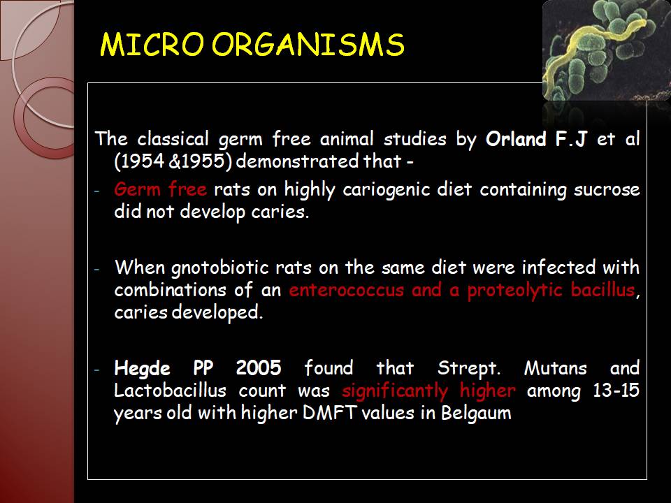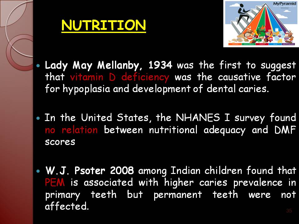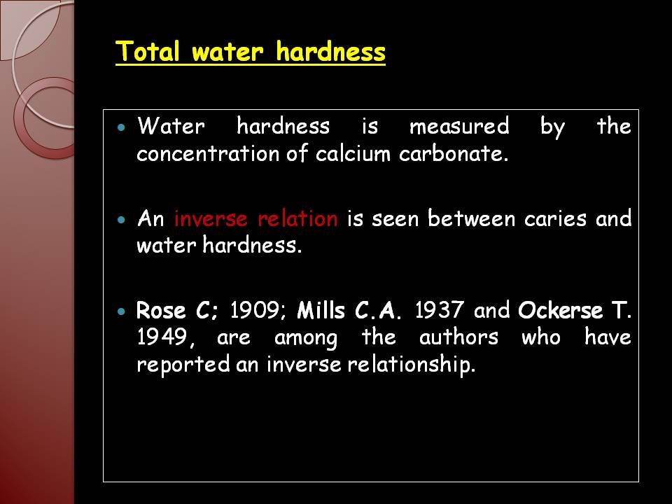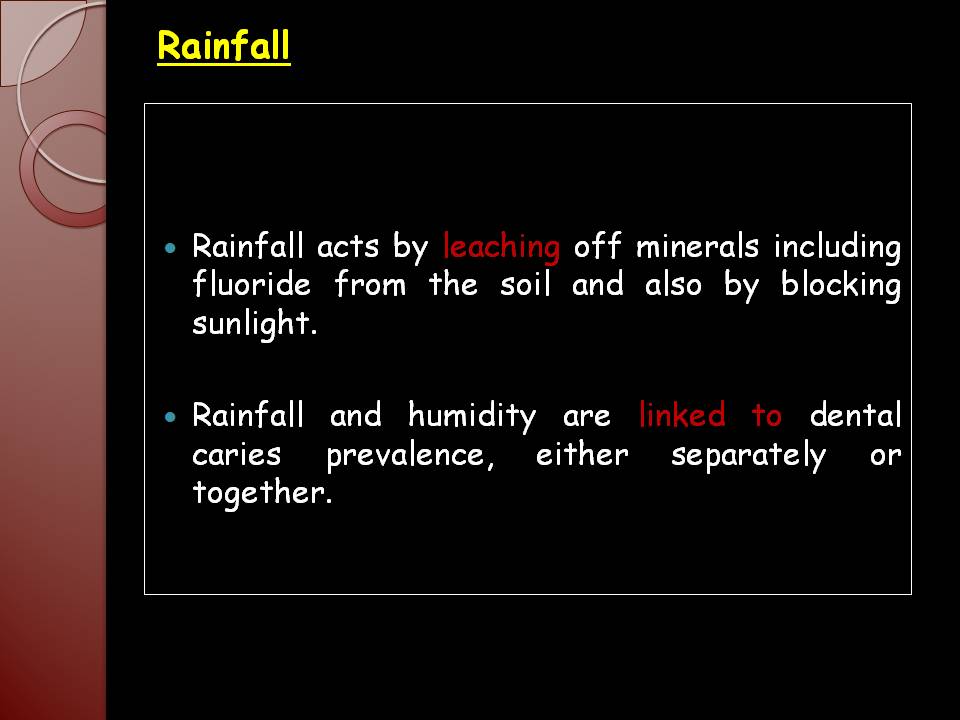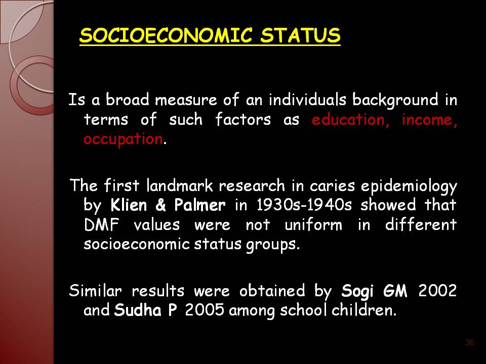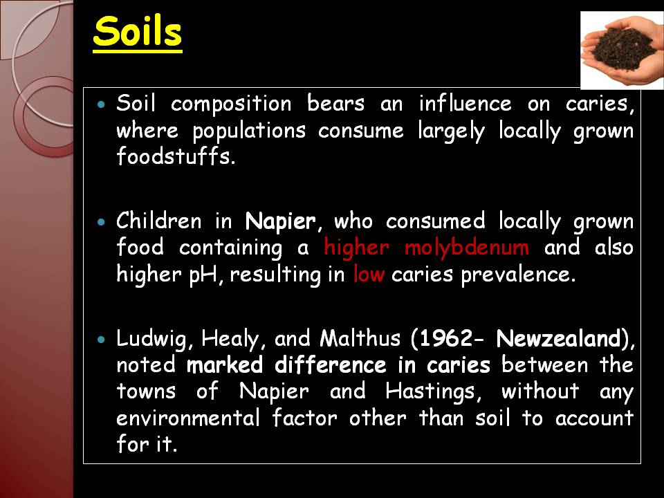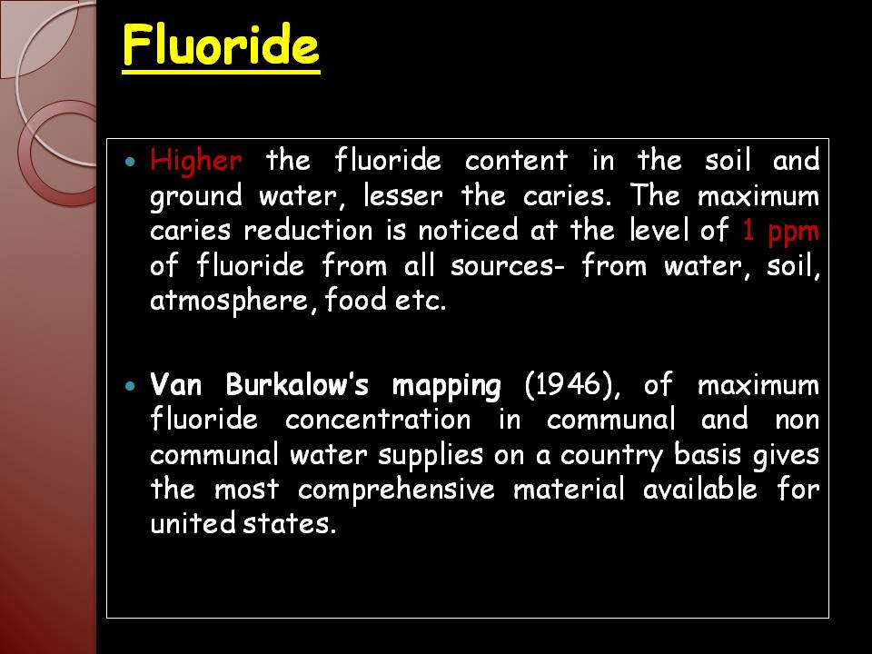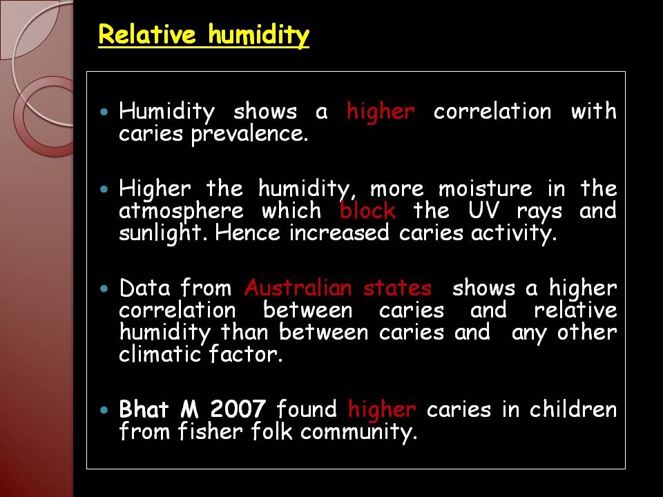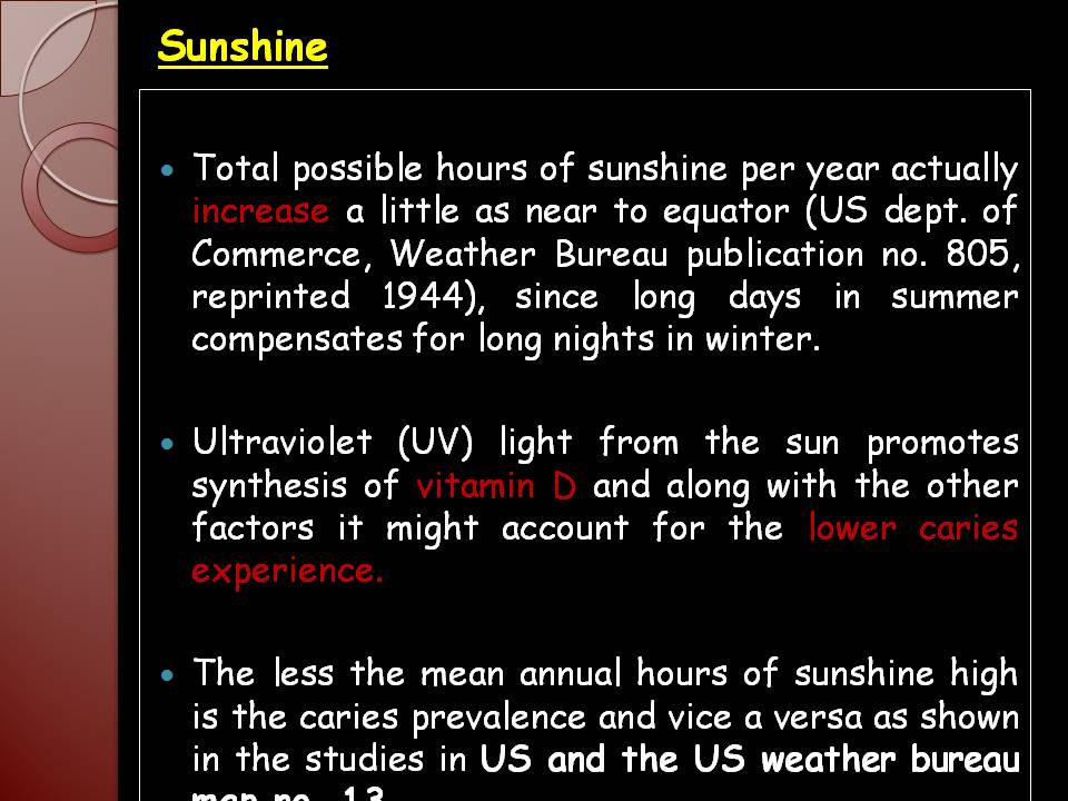 The three military studies best adapted to geographic analysis are those of Britten and Perrott (1941); Ferguson R.A (1935); and Nizel and Bibby (1944). The first study gives the prevalence of detectable dental defects among men who were rejected or accepted for limited duty in World War I. The second study gives the average number of decayed, missing, and filled teeth per recruit among 4,602 white naval recruits seen at one induction centre in peacetime. The third study gives average number of decayed missing teeth per selectee among 22,117 men at a large Army camp in World War II. Each of these three studies in itself show a pronounced geographic pattern for prevalence of dental disease. Latitude In the USA, the northeastern region has the highest and south-central region the lowest prevalence of caries (Klein and Palmer, 1937 and US public health service, 1988). Corroboration of this increase in dental disease with latitude is found (Mills C.A. (1937). Russell A.L. 1966 listed that the countries near the equator like India, Ethiopia, and China showed less caries compared to countries away from equator like Australia and New Zealand Distance from seacoast Caries prevalence is maximum at the seacoast and more the distance travelled away from the coastal region there will be less caries activity. Ockerse T (1949), analyzed the effect of latitude and distance from seacoast in South Africa. Andrews N.H. (1948), studied 2,000 members of the royal Australian Air Force, dividing his data by states. He found that the counts of DMF teeth vary considerably according to latitude. Sunshine Total possible hours of sunshine per year actually increase a little as near to equator (US dept. of Commerce, Weather Bureau publication no. 805, reprinted 1944), since long days in summer compensates for long nights in winter. Ultraviolet (UV) light from the sun promotes synthesis of vitamin D and along with the other factors it might account for the lower caries experience. The less the mean annual hours of sunshine high is the caries prevalence and vice a versa as shown in the studies in US and the US weather bureau map no. 13. Temperature Temperature varies with latitude and altitude. It acts to vary the caloric requirements and water intake of humans. Hence lower the temperature, higher the caries prevalence. Relative humidity Humidity shows a higher correlation with caries prevalence. Higher the humidity, more moisture in the atmosphere which block the UV rays and sunlight. Hence increased caries activity. Data from Australian states shows a higher correlation between caries and relative humidity than between caries and any other climatic factor. Bhat M 2007 found higher caries in children from fisher folk community. Rainfall Rainfall acts by leaching off minerals including fluoride from the soil and also by blocking sunlight. Rainfall and humidity are linked to dental caries prevalence, either separately or together. Fluoride Higher the fluoride content in the soil and ground water, lesser the caries. The maximum caries reduction is noticed at the level of 1 ppm of fluoride from all sources- from water, soil, atmosphere, food etc. Van Burkalow’s mapping (1946), of maximum fluoride concentration in communal and non communal water supplies on a country basis gives the most comprehensive material available for united states. Total water hardness Water hardness is measured by the concentration of calcium carbonate. An inverse relation is seen between caries and water hardness. Rose C; 1909; Mills C.A. 1937 and Ockerse T. 1949, are among the authors who have reported an inverse relationship. Soils Soil composition bears an influence on caries, where populations consume largely locally grown foodstuffs. Children in Napier, who consumed locally grown food containing a higher molybdenum and also higher pH, resulting in low caries prevalence. Ludwig, Healy, and Malthus (1962- Newzealand), noted marked difference in caries between the towns of Napier and Hastings, without any environmental factor other than soil to account for it. Urbanization Furguson R.A. (1935), attributed the regional variations he found in caries to the greater frequency of large industrial cities in the North America. Rao SP 1993 found that dental caries were more prevalent among urban children than rural and tribal children. Similar results were obtained by Vinit Dhar 2009 among children of Udaipur city Nutrition Nutrition can also be included under environmental factors as geographic (soil, temperature), cultural or educational factors, which might influence food availability and, in turn, might contribute either for increase or decrease in caries activity. e.g. previously Eskimos diet included only animal fat from fish and seals (proteins and fats). The results have been excellent for the Eskimos dentition, as the work of Waugh L.M. (1931) and others testifies. Social factors Like economic status, social pressure, affordability, provision of good preventive measures etc. might create more demand for better dental care and leads to lesser caries prevalence. Sogi GM 2002 and Sudha P 2005 showed that social factors has a influence on prevalence of dental caries. ¢The term pandemic is customarily reserved for global disease outbreaks that are acute and fatal, suggests an impact on populations of entire countries, continents, or much of the world. ¢The term therefore implies two elements: global distribution and severe consequence ¢By this definition dental caries can be characterized as a pandemic—Global Distribution and profound severity and societal significance The World Health Organization’s 2003 report on oral health provides an overview of global caries epidemiology Globally, WHO reports caries prevalence in school age children at 60–90% and as virtually universal among adults in the majority of countries ¢Global overview of changes in dental caries levels focuses on 12-year-olds, since they are the most commonly studied age