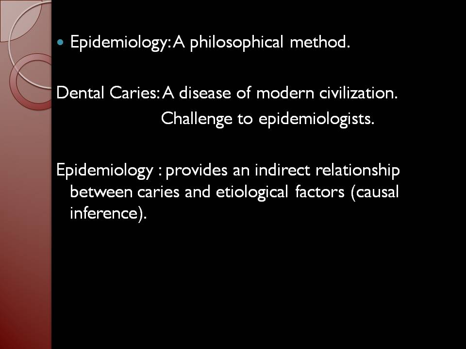 Epidemiology : provides an indirect relationship between caries and etiological factors (causal inference).