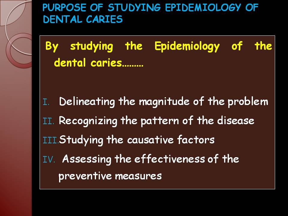 By studying the Epidemiology of the dental caries……… I.Delineating the magnitude of the problem II.Recognizing the pattern of the disease III.Studying the causative factors IV. Assessing the effectiveness of the preventive measures HISTORY