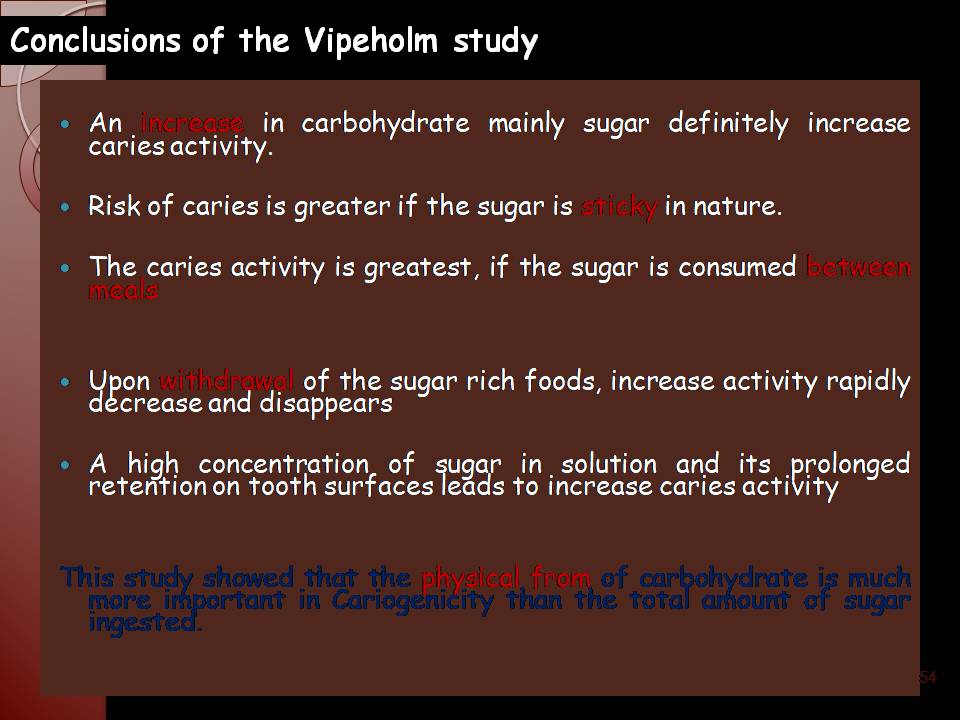 This study showed that the physical from of carbohydrate is much more important in Cariogenicity than the total amount of sugar ingested.