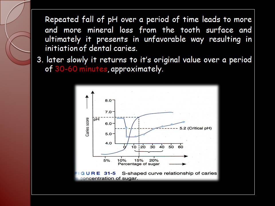 2. following exposure to sugars the pH drops very rapidly (in few minutes) to it’s lowest level 5.5-5.2 – critical pH.