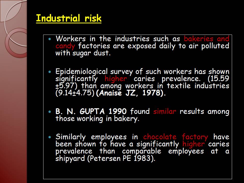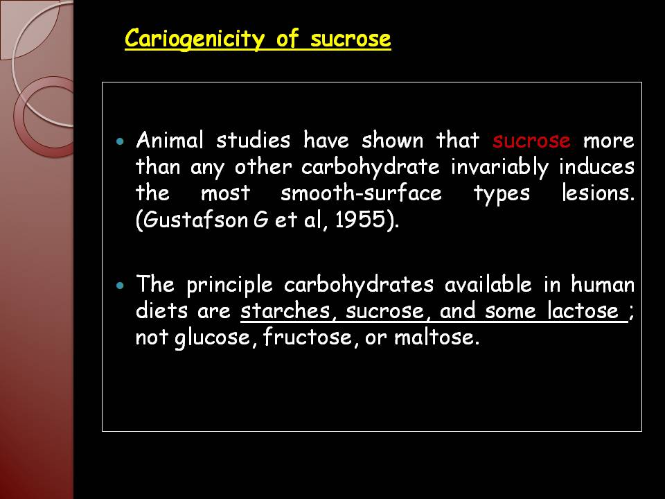 3. later slowly it returns to it’s original value over a period of 30-60 minutes, approximately. Industrial risk Workers in the industries such as bakeries and candy factories are exposed daily to air polluted with sugar dust. Epidemiological survey of such workers has shown significantly higher caries prevalence. (15.59 ±5.97) than among workers in textile industries (9.14±4.75) (Anaise JZ, 1978). B. N. GUPTA 1990 found similar results among those working in bakery. Similarly employees in chocolate factory have been shown to have a significantly higher caries prevalence than comparable employees at a shipyard (Petersen PE 1983). Cariogenicity of sucrose Animal studies have shown that sucrose more than any other carbohydrate invariably induces the most smooth-surface types lesions. (Gustafson G et al, 1955). The principle carbohydrates available in human diets are starches, sucrose, and some lactose ; not glucose, fructose, or maltose. Phosphates and dental caries