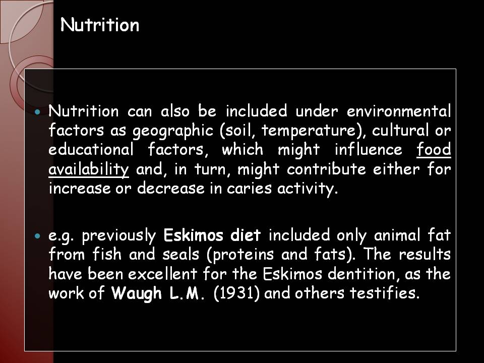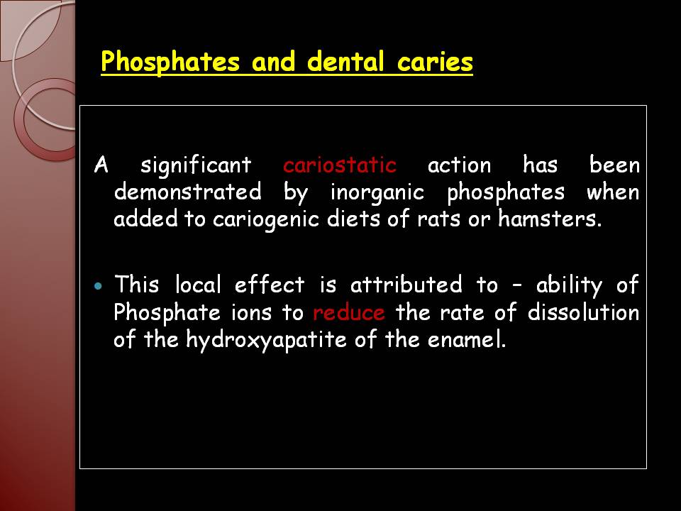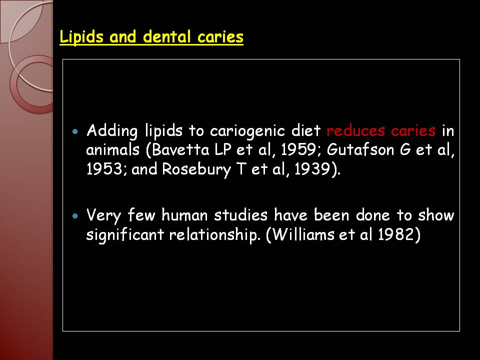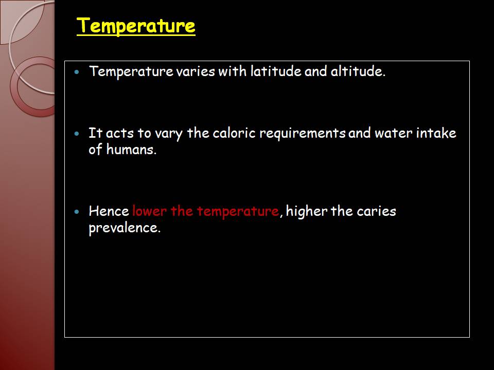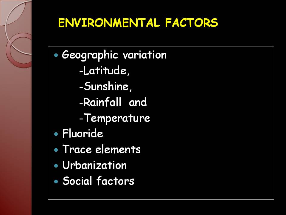A significant cariostatic action has been demonstrated by inorganic phosphates when added to cariogenic diets of rats or hamsters. This local effect is attributed to – ability of Phosphate ions to reduce the rate of dissolution of the hydroxyapatite of the enamel. – Lipids and dental caries Adding lipids to cariogenic diet reduces caries in animals (Bavetta LP et al, 1959; Gutafson G et al, 1953; and Rosebury T et al, 1939). Very few human studies have been done to show significant relationship. (Williams et al 1982) ENVIRONMENTAL FACTORS Geographic variation