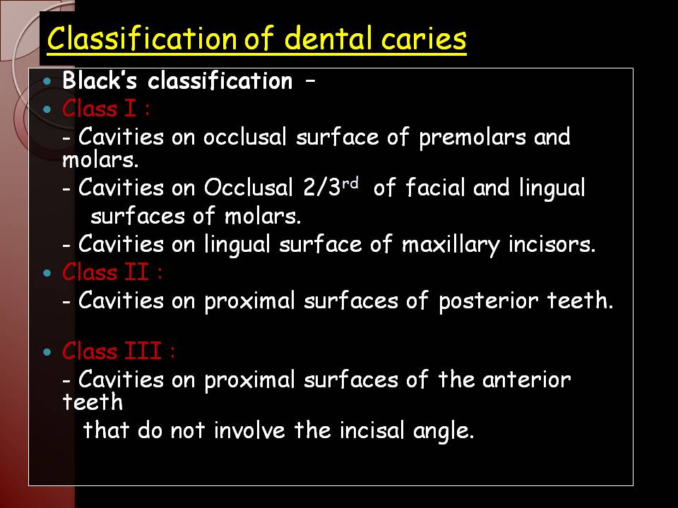 Pre-historic Race (15,000yrs.back). Classification of dental caries Black’s classification – Class I :
