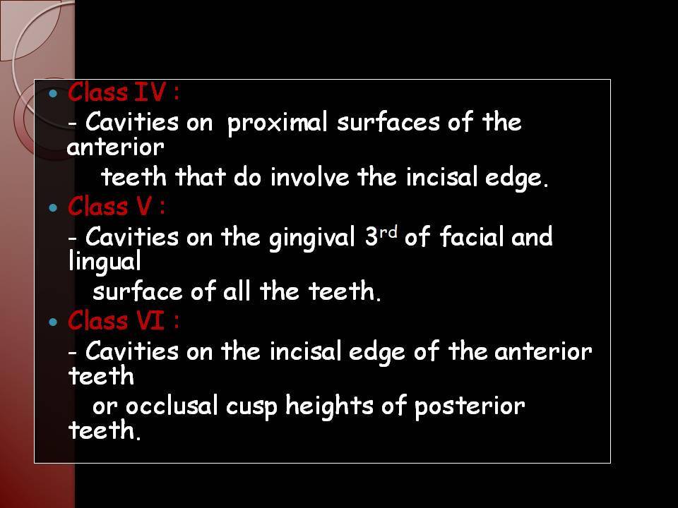 – Cavities on proximal surfaces of posterior teeth. Class III :