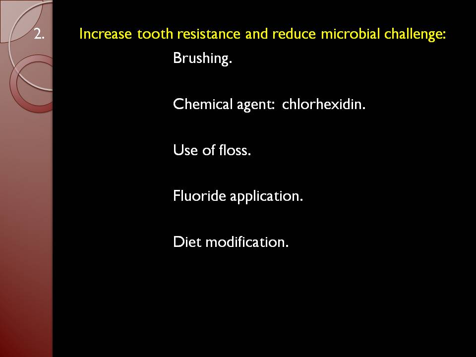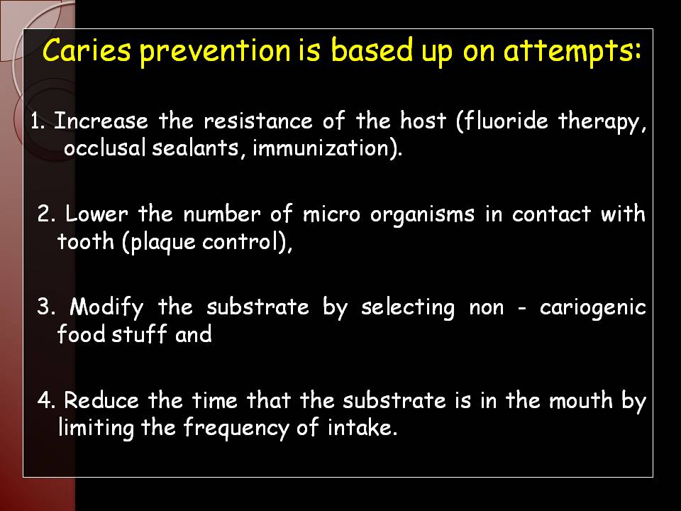 1. Increase the resistance of the host (fluoride therapy, occlusal sealants, immunization).