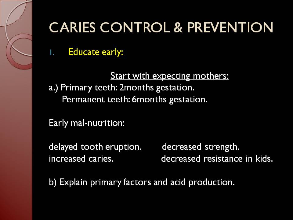 4. Reduce the time that the substrate is in the mouth by limiting the frequency of intake. CARIES CONTROL & PREVENTION 1.Educate early: