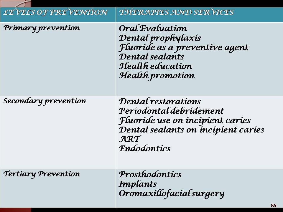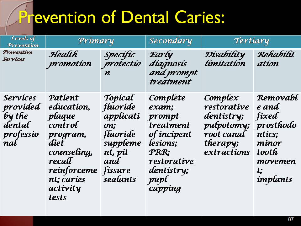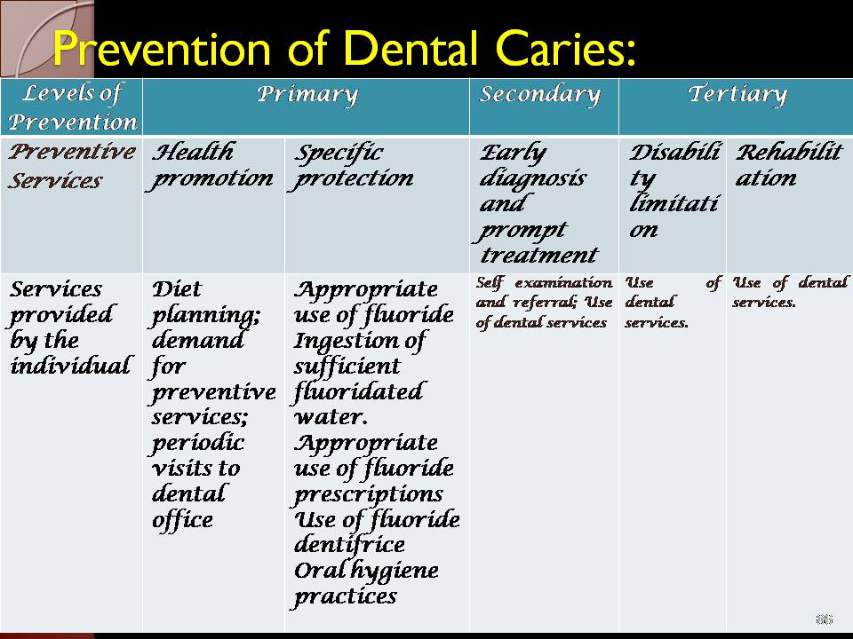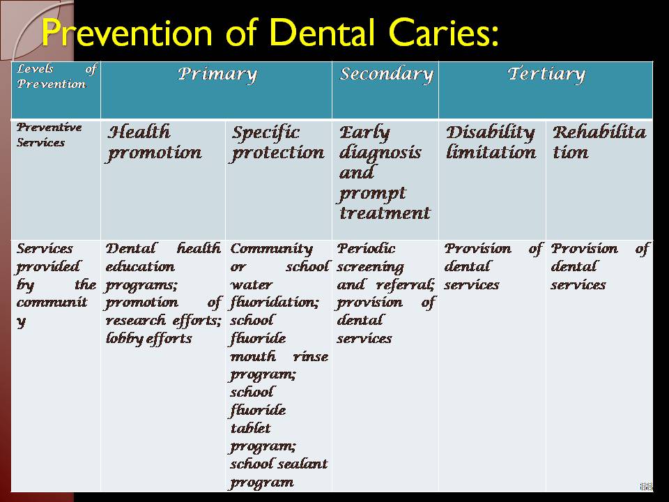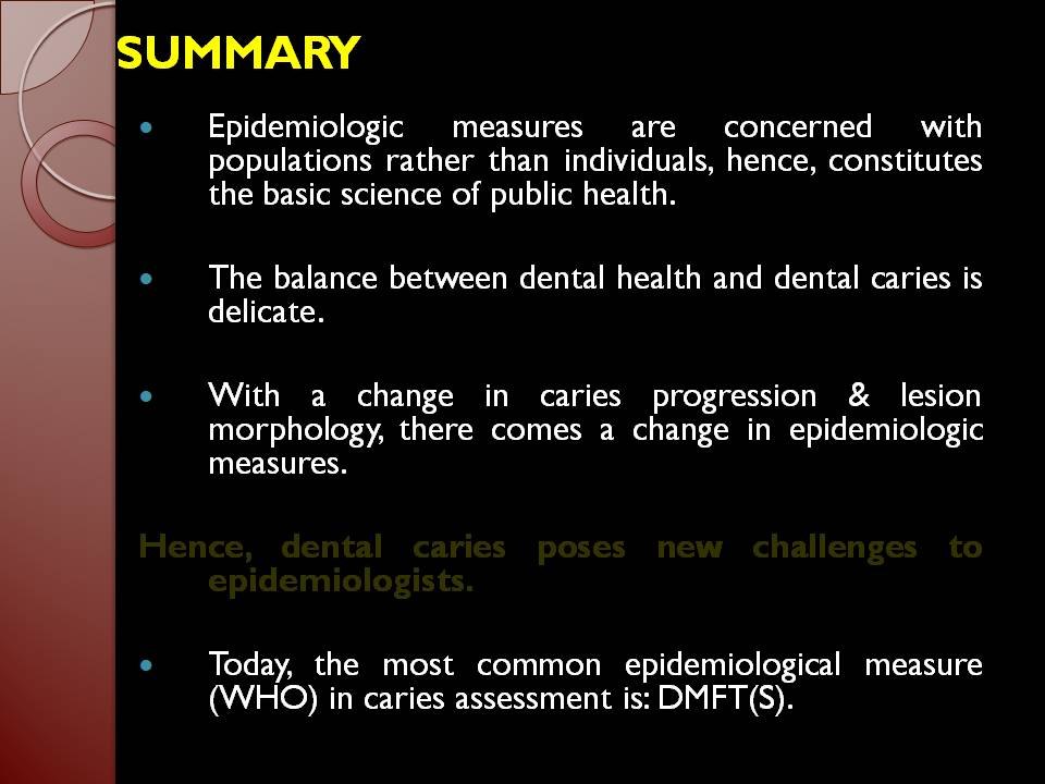 Diet modification. Prevention of Dental Caries: Prevention of Dental Caries: Prevention of Dental Caries: SUMMARY Epidemiologic measures are concerned with populations rather than individuals, hence, constitutes the basic science of public health. The balance between dental health and dental caries is delicate. With a change in caries progression & lesion morphology, there comes a change in epidemiologic measures.