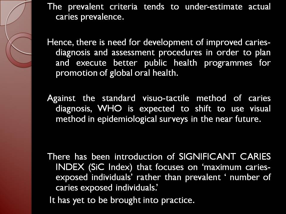 There has been introduction of SIGNIFICANT CARIES INDEX (SiC Index) that focuses on ‘maximum caries-exposed individuals’ rather than prevalent ‘ number of caries exposed individuals.’