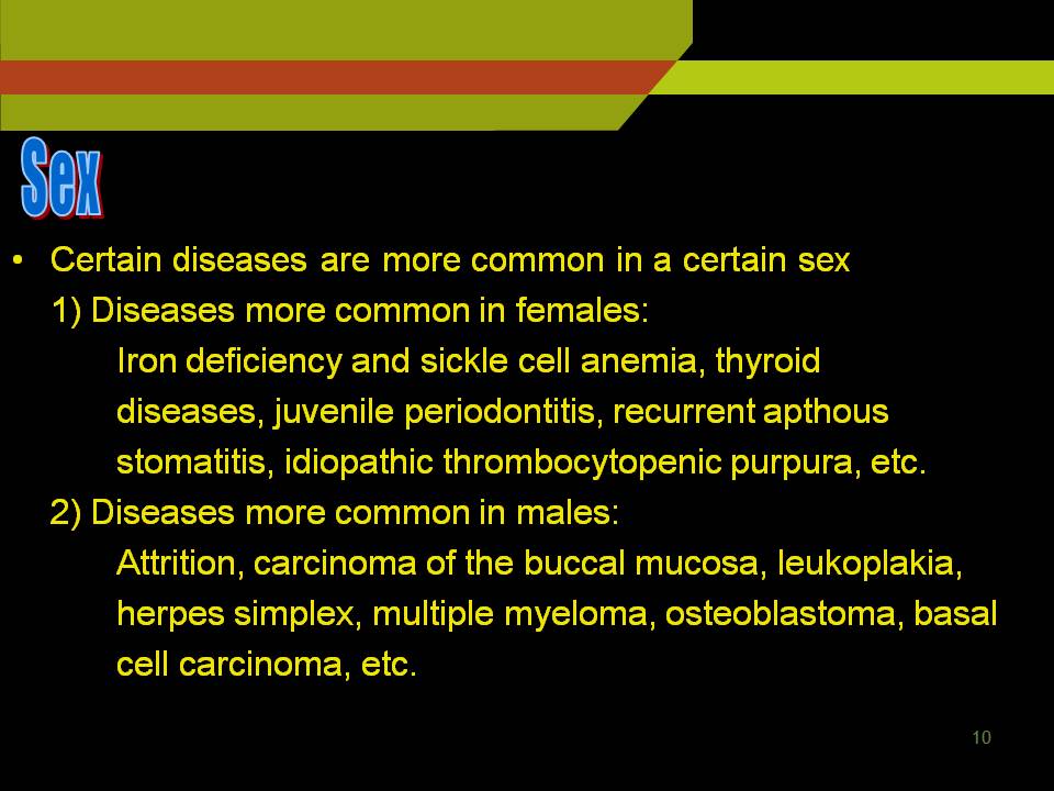 Iron deficiency and sickle cell anemia, thyroid diseases, juvenile periodontitis, recurrent apthous stomatitis, idiopathic thrombocytopenic purpura, etc.