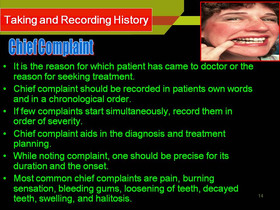 Most common chief complaints are pain, burning sensation, bleeding gums, loosening of teeth, decayed teeth, swelling, and halitosis.