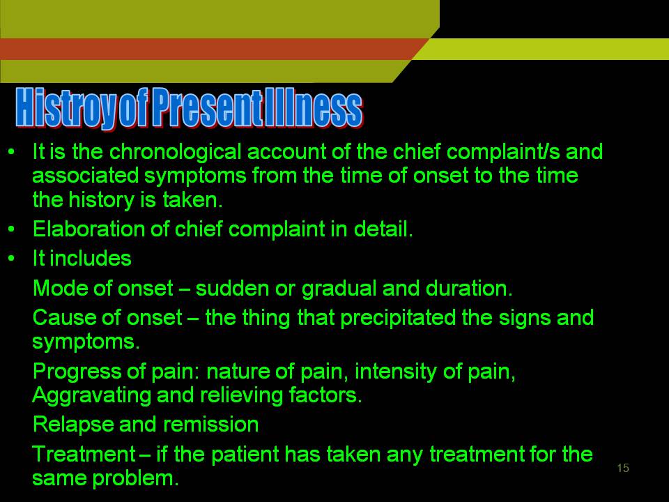 It is the chronological account of the chief complaint/s and associated symptoms from the time of onset to the time the history is taken.