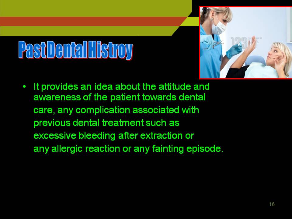 It provides an idea about the attitude and awareness of the patient towards dental care, any complication associated with previous dental treatment such as excessive bleeding after extraction or any allergic reaction or any fainting episode.