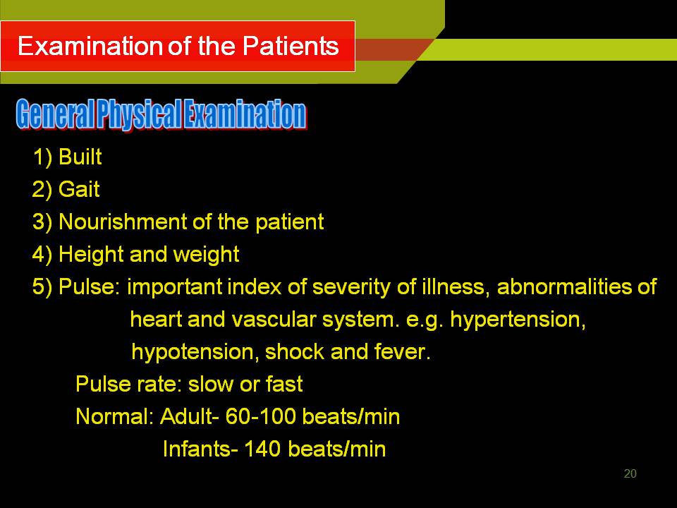 - The history and physical examination continues, from the time the patient enters the consultation room, till he leaves it.