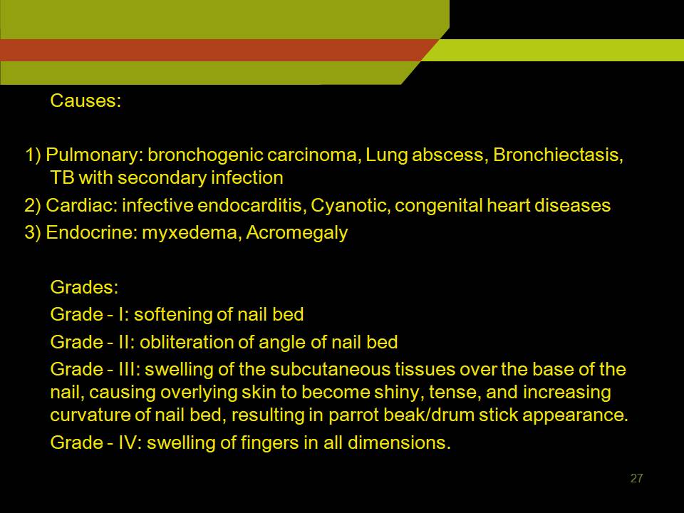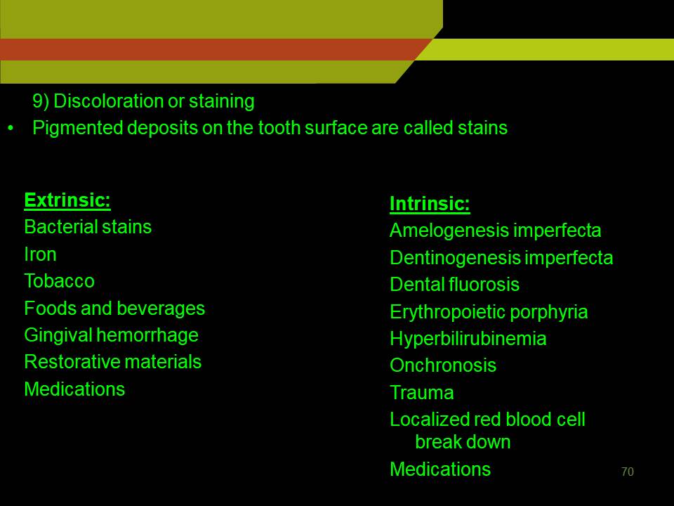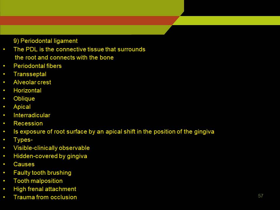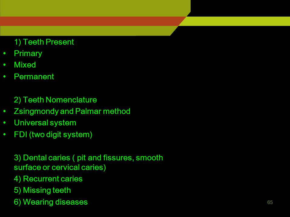 for eg. – Attrition, abrasion, gingival recession, periodontitis,