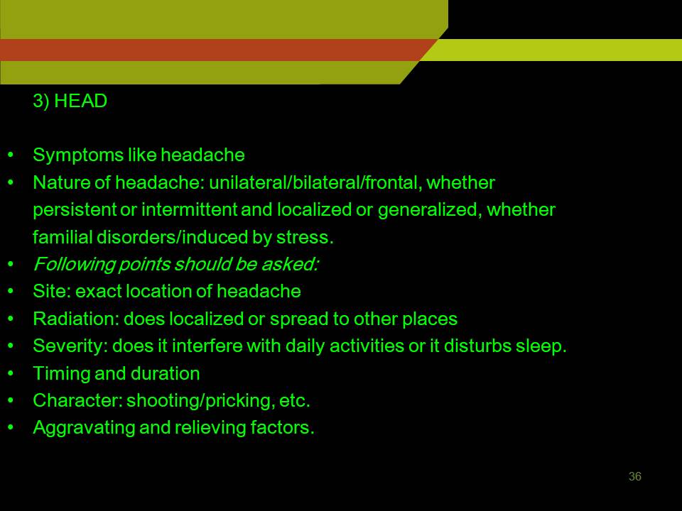 Progress of pain – nature of pain, intensity of pain, Aggravating and relieving factors.