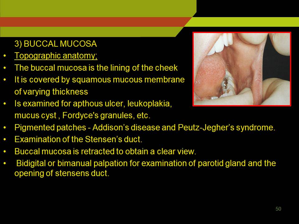 Attrition, carcinoma of the buccal mucosa, leukoplakia, herpes simplex, multiple myeloma, osteoblastoma, basal cell carcinoma, etc.