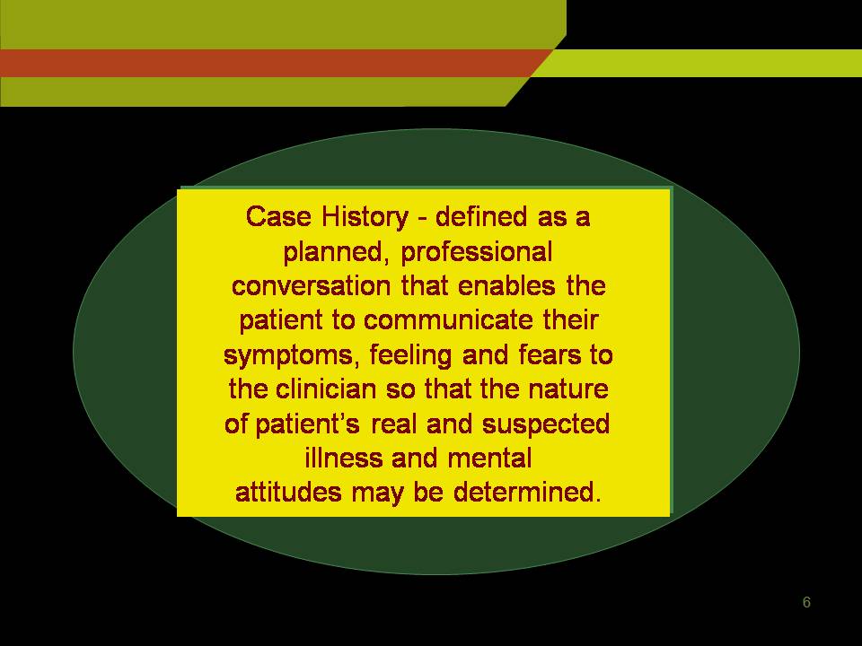 Case History – defined as a planned, professional conversation that enables the patient to communicate their symptoms, feeling and fears to the clinician so that the nature of patient’s real and suspected illness and mental attitudes may be determined.