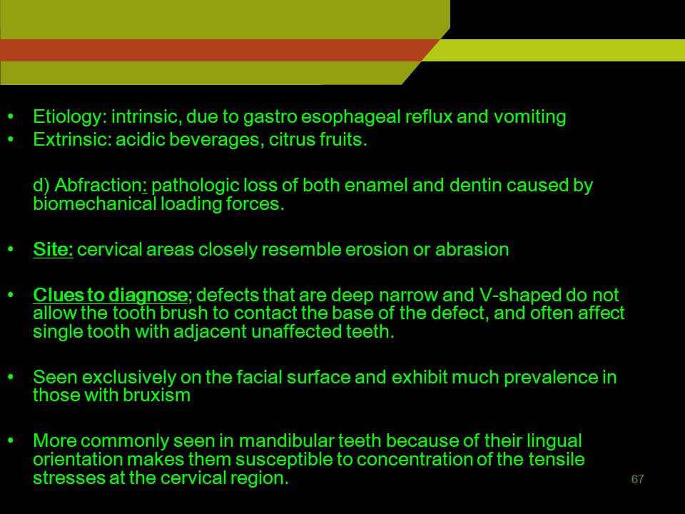 - Etiology: use of abrasive dentifrice, tooth floss, tooth picks and in tailors who as habit of opening bobby pins with the teeth.