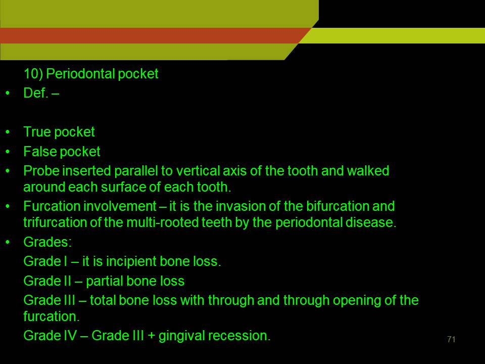 - Furcation involvement – it is the invasion of the bifurcation and trifurcation of the multi-rooted teeth by the periodontal disease.