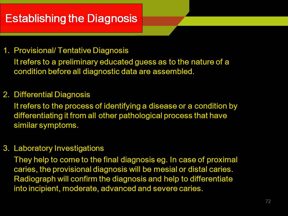They help to come to the final diagnosis eg. In case of proximal caries, the provisional diagnosis will be mesial or distal caries. Radiograph will confirm the diagnosis and help to differentiate into incipient, moderate, advanced and severe caries.