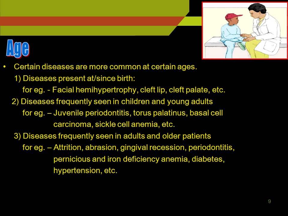 for eg. – Juvenile periodontitis, torus palatinus, basal cell